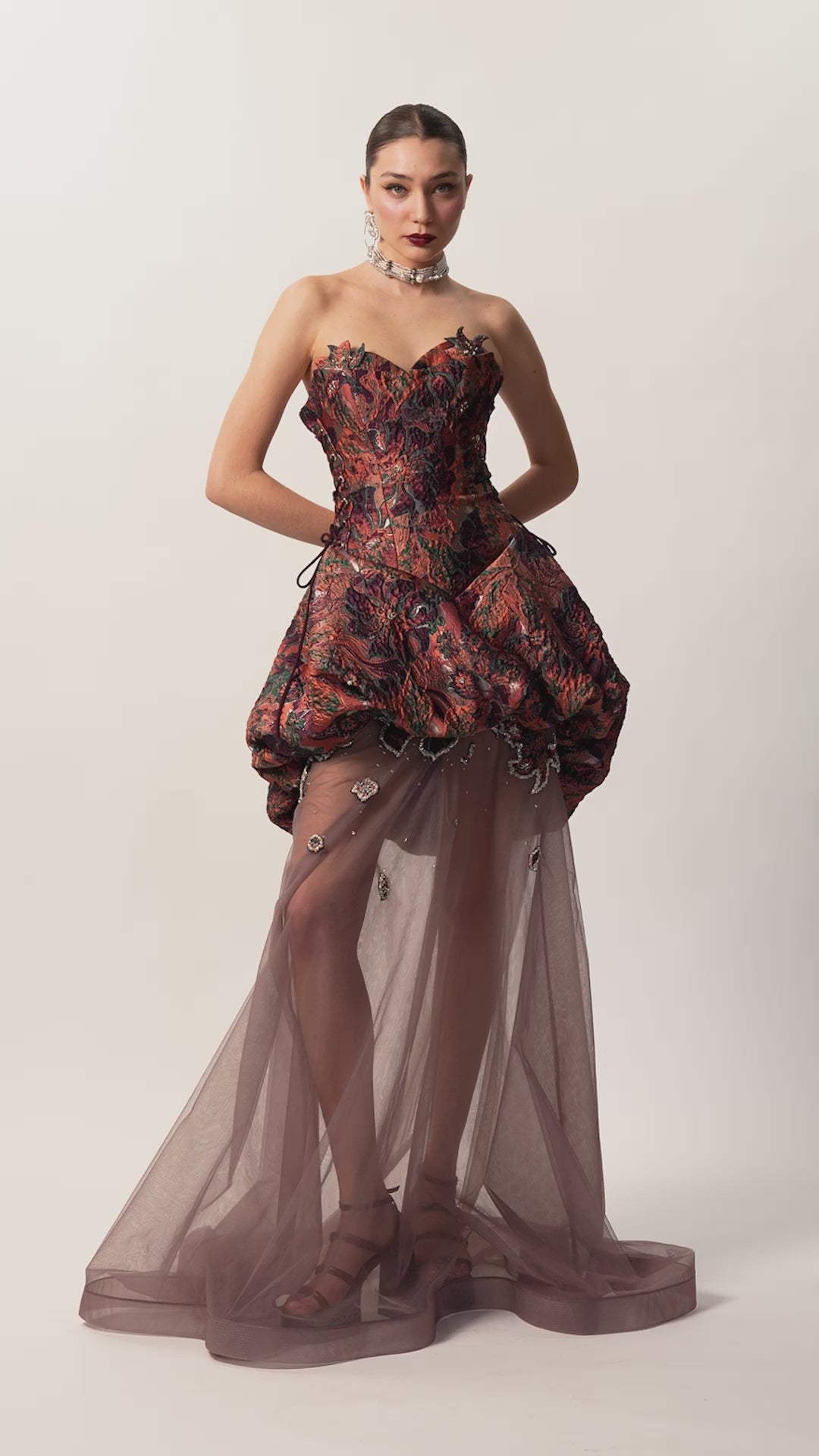 Elevate your evening elegance with the Dahlia Maxi Dress. Featuring a structured corset top crafted from intricately embroidered brocade fabric, this dress showcases exquisite hand-embroidered applique details. The flowing embroidered tulle skirt is enhanced with a delicate side string tie, creating a graceful silhouette perfect for engagements or special invitations. Designed to captivate, the Dahlia Maxi Dress combines timeless sophistication with artisan craftsmanship for unforgettable moments.